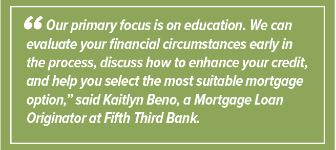 “Our primary focus is on education. We can evaluate your financial circumstances early in the process, discuss how to enhance your credit, and help you select the most suitable mortgage option,” said Kaitlyn Beno, a Mortgage Loan Originator at Fifth Third Bank. “Many people don’t have a 20% down payment, and while there are various programs available to assist, our role is to guide you in choosing the mortgage that best fits your specific needs.”