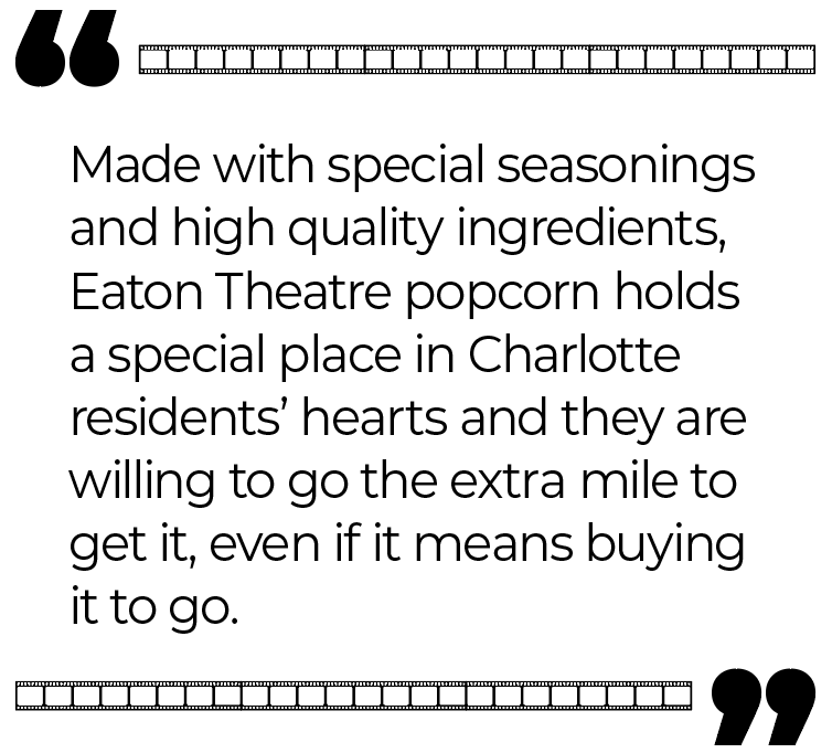 Made with special seasonings and high quality ingredients, Eaton Theatre popcorn holds a special place in Charlotte residents’ hearts and they are willing to go the extra mile to get it, even if it means buying it to go. In fact, the movie snacks to-go option has continued, even with the pandemic fading. Patrons can still buy popcorn and other concession snacks to go during business hours, with the option of curbside pickup.